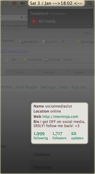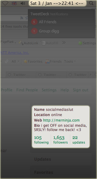 I started seeing profiles following me [ @andrewburnett ] which disturbed me. I have only been on Twitter since May 2008, since then I have seen some disturbing things, but not like this! Things that may put me off following back are the content of tweets or the website a follower has listed on their profile. There is a freshly laid dog-ploppy on my doorstep of late.